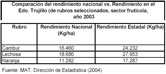 Para evaluar los rendimientos de los principales rubros, resulta de interés comparar tales indicadores con los resultados obtenidos a nivel nacional y estadal, los cuales según los datos de la Dirección de Estadística del MAT para el 2003, muestran el siguiente comportamiento (Cuadro 2).