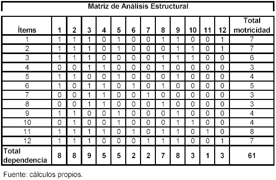 b) Establecimiento de relaciones entre las variables consideradas estratégicas a través de una MAE: en esta etapa se utiliza una matriz de doble entrada para identificar las variables independientes y dependientes. Sobre la base del impacto de una variable sobre la otra se le asigna el valor cero (si existe independencia en la relación) o uno (en caso de dependencia); la sumatoria de los 1 por fila refleja el total de motricidad, que representa la fuerza que tiene cada variable sobre las demás variables del sistema; mientras que la sumatoria de los 1 por columna muestra la dependencia e indica el número de veces en que una variable es influenciada por el resto.