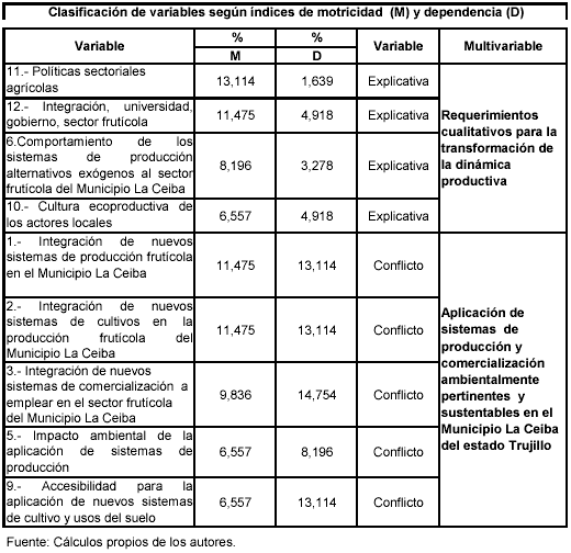 En la clasificación de variables presentada en el Cuadro 6 se observa que la transformación de los sistemas productivos del sector frutícola del Municipio La Ceiba, en un espacio temporal delimitado de diez años, debe considerar los lineamientos estratégicos relacionados directamente con las multivariables ya descritas: la primera, de carácter explicativo y relacionada con los requerimientos cualitativos, representa el mundo intangible donde se manifiestan las ideas, el conocimiento, las políticas y directrices que determinan y direccionarán las acciones concretas que soportan la segunda multivariable conflictiva.