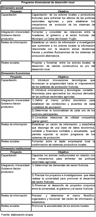 El programa dimensional se estructuró delimitando, para el sector frutícola del Municipio La Ceiba, tres dimensiones de orden social, económico e institucional que conforman el contexto de la multivariable cualitativa. A partir de ella se establecieron los proyectos y objetivos orientados a transformar la dinámica de los sistemas productivos (Cuadro 7).