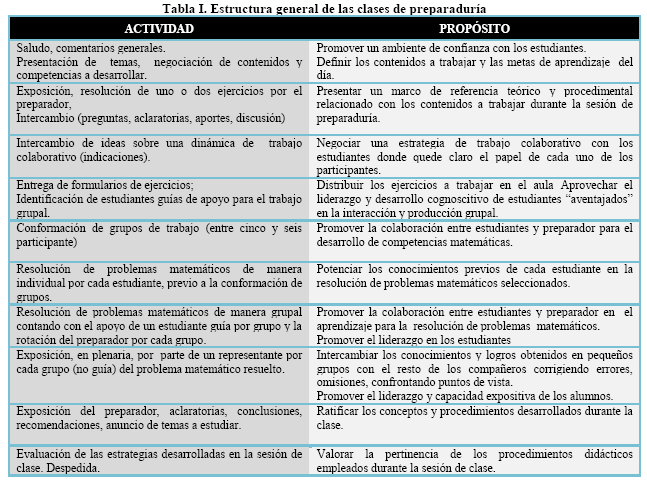 La estructura de clases propuesta, ejecutada en su conjunto, trata de integrar los medios con los aspectos teóricos conceptuales de los contenidos matemáticos, las estrategias de resolución de problemas (ejercitación) y las relaciones teoría práctica, con otros contenidos y problemas matemáticos, a través de procesos mediados por estudiantes guías y preparadores.