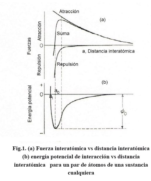 En la Fig.1 se tiene un esquema de las fuerzas interatómicas y la energía potencial de interacción en función de la distancia interatómica para un par de átomos de una sustancia cualquiera.
