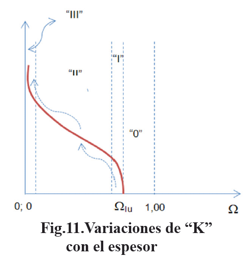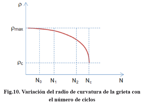 En la Fig.11, "ΩIu" es un factor de corrección umbral, al cual le corresponde un radio de curvatura umbral "ρIu". Para ΩIu ≤Ω ≤1,00, los cambios en el radio de curvatura son mínimos y no se detectan cambios en el tamaño de la grieta, es la zona "0". En la zona "I" los radios de curvatura empiezan a disminuir y la grieta empieza a crecer lentamente; en la zona "II" hay un crecimiento sostenido y regular de la grieta; en la zona "III" hay un crecimiento rápido, hasta hacerse inestable, lo que conduce a la fractura.