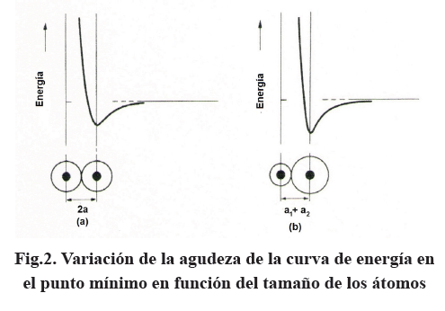 Al disminuir el tamaño de los átomos aumenta la energía de enlace, aumenta la rigidez, esto es, la pendiente de la recta, o sea k y E, y la agudeza de la curvatura en el valor mínimo es mayor, como se muestra en la Fig.2. Naturalmente, la profundidad da el valor de la energía potencial.