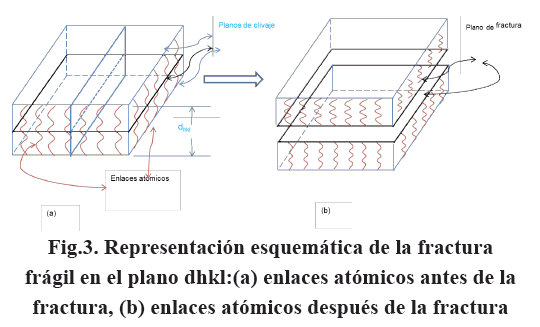 El volumen V a considerar es el volumen de enlaces atómicos entre dos planos de clivaje de área A y espaciados una distancia dhkl, así tenemos un volumen enlaces atómicos V= A.dhkl. En la ec. (11), el primer factor es la energía por unidad de volumen y el segundo factor es, atomísticamente, la mitad del volumen de los enlaces atómicos rotos. En la Fig.3 se tiene una representación esquemática de la fractura en un plano de clivaje.