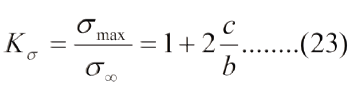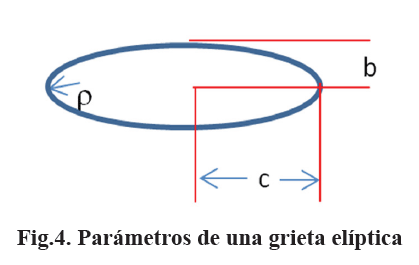 Donde smax es el esfuerzo en la punta de la grieta y s¥ es el esfuerzo remoto, perpendicular al eje mayor de la elipse. En la Fig.4 se tiene el significado de los simbolos empleados en la ec. (23). Una grieta de dos puntas, como las que se encuentran en el centro de la lamina, tiene una longitud "2c"; una grieta de una punta, como las que se encuentra en los bordes de la lamina, tiene una longitud "c";"b" es el semiancho de la grieta eliptica.