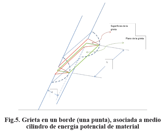 La grieta ya existe, los enlaces atómicos no llegaron a formarse y el material alrededor de la grieta quedó con una energía potencial equivalente a su ruptura. Se sigue con el pensamiento de que toda la energía involucrada en el proceso de fractura es energía elástica, es decir fractura frágil. El criterio que se establece para utilizar la ec. (12) es que el volumen elástico de material afectado por la grieta es aquel cilindro cuyo radio es c y cuya longitud es L. El plano de la grieta reemplaza al plano de clivaje; dos puntas representan una superficie y una punta representa media superficie del plano de grieta, la cual está asociada a medio volumen de cilindro, ambos asociados a medio volumen de enlaces atómicos no formados, como se muestra en la Fig.5 para una grieta en un borde. Esta nueva concepción separa el plano de la grieta de las superficies de fractura, asociando las energías correspondientes con el plano de la grieta. El plano de la grieta pasa a ser una sección principal del cilindro de energía elástica.