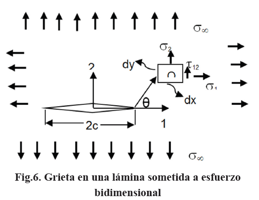 En la Fig.6 se tiene una representacion grafica de una grieta en una lamina de dimensiones infinitas sometida a un estado bidimensional de esfuerzos.