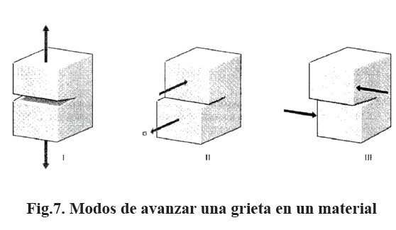 Pronto se reconoció que la grieta puede propagarse de tres modos: modo I, abriendo; modo II, deslizando; modo III torciendo o desgarrando, como se muestra en la Fig. 7. En el modo I el esfuerzo es de tensión, normal al plano de la grieta; en los modos II y III el esfuerzo es de corte en el plano de la grieta; en el modo II es perpendicular a la grieta y en el modo III es paralelo.