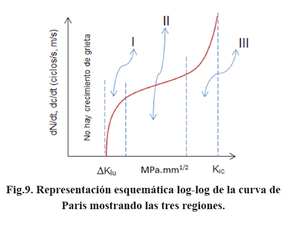 Donde N es el número de ciclos y σa" es la amplitud del esfuerzo. En 1963, Paul Paris, de la universidad de Lehigh. USA, lideró proyectos de tesis doctorales en los que se realizaban ensayos de fatiga, en diversas condiciones, con diferentes tamaños iniciales de grieta y se trazaban las curvas c=f(N). En cada punto de estas curvas se tiene el tamaño de la grieta, con lo que se calcula ΔK según (43a) y mediante la tangente endicho punto se calcula dc/dN. Todos estos valores se tabulan y se traza una gráfica log-log, con lo que se obtiene una curva cuya forma genérica se muestra en la Fig.9, llamada impropiamente curva de Paris, en la que se distingue un ΔKI umbral (ΔKIu"), por debajo del cual no hay crecimiento de grieta; una región "I" de crecimiento relativamente lento de grieta; una región "II" de crecimiento estable o constante de grieta y una región "III" de crecimiento rápido o inestable hasta alcanzar el valor crítico "KIC".