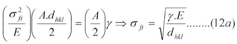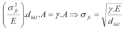 Esta ecuación es genérica y es otro de los aportes de este trabajo. Para una fractura por clivaje V*= dhkl.A y A*=A, donde dhkl es la distancia entre los planos de clivaje y "A" el área del plano de clivaje, igual al área de una base del paralelepípedo. si "σft" es el esfuerzo de fractura teórico, se tiene: