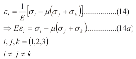 Consideremos una lámina y sobre ella un sistema cartesiano de referencia: 1≡X, 2≡Y, 3≡Z (espesor). Consideremos un material isótropo y hookeniano. Si la carga se aplica en la dirección 1, entonces μ=-ε2/ ε1=-ε3/ε1; si en la dirección 2, μ=-ε1/ε2=-ε3/ε2; si en la dirección 3, μ=-ε1/ε3=- ε2/ε3. Como consecuencia de ello al aplicar la carga en la dirección "1" se produce una deformación directa ε1=σ1/E, y en la dirección 2, ε2=-με1=μσ1/E y en la dirección "3", ε3 = με1=μσ1/E. Al aplicar la carga en la dirección 2, el efecto en la dirección 1 es ε1=-με2=-μσ2/E; así mismo al aplicarse la carga en la dirección "3", el efecto en la dirección 1 es ε1 =-με3=-μσ3/E. Aplicando el principio de superposición podemos escribir ε1 = σ1/E -μσ2/E-μσ3/E = 1/E. [σ1-μ(σ2+σ3). De manera genérica y usando notación tensorial: