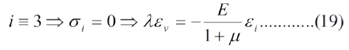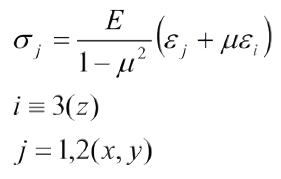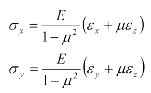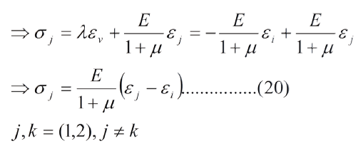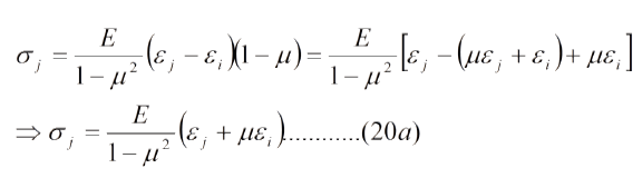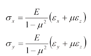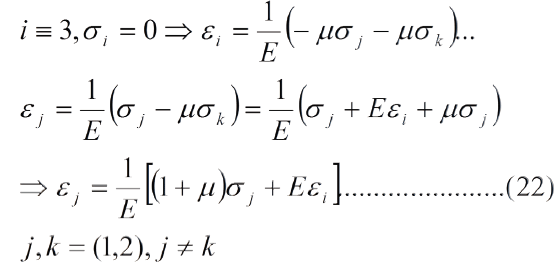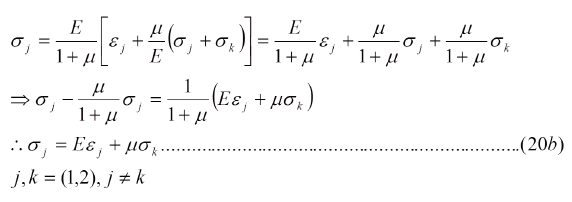 El esfuerzo en las direcciones "1" y "2" viene dado por la ec. (20). En la ec. (20) se puede convertir la diferencia de deformaciones en una suma, multiplicando el numerador y el denominador por (1-µ) y recordando que, para materiales isotropos, µ = -ei/ej,