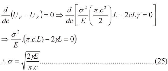 La ec. (25) es la famosa ecuación de Griffith para la condición de esfuerzo plano, la cual es similar a la ec. (24) pero de concepción completamente distinta. La dUV/dc recibe el nombre de rapidez de liberación de energía de deformación elástica o fuerza motriz de la grieta, nombres asignados por el físico americano George Rankin Irwin en 1956.