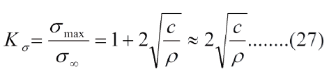 La ec. (27) señala que cuanto mayor es el tamaño de la grieta y más aguda es ésta mayor es el factor concentrador de esfuerzo. La ec. (26) indica que cuanto mayor es el factor concentrador de esfuerzo menor es el esfuerzo necesario para que la grieta crezca.