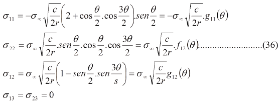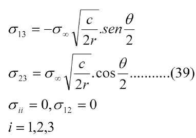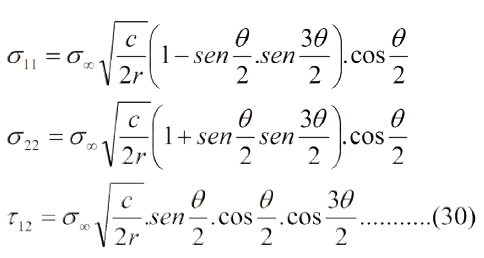 Para un punto Q(r,q.), ubicado en un plano perpendicular a la grieta, las ecuaciones que describen el campo de esfuerzos alrededor de la grieta, que hoy día se manejan, son las siguientes [6]: