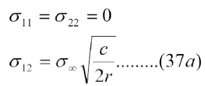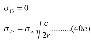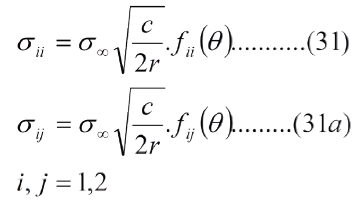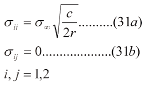 Las ecs. (30) son genericas en su derivacion y son aplicables a cualquier cuerpo cristalino o amorfo que contenga una grieta, sea este metal, roca, ladrillo, hielo, plastico, etc. A posteriori es que se relacionan con las ecs. (14) para seleccionar una condicion particular.