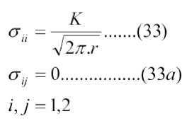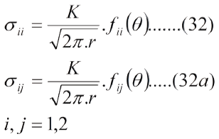 Para los puntos que están justo frente a la punta de la grieta, que son los que interesan en ingeniería, q.= 0, se tiene que fii(0) = 1 y fij(0) = 0. De modo que la ec. (31) se simplifica: