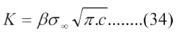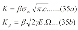 Comparando las ecs. (31a) y (33) e incorporemos un factor ß que da la experiencia, cuyo valor es 1,00 para grietas centrales y 1,12 para grietas en el borde se tiene: