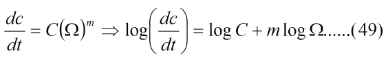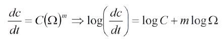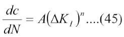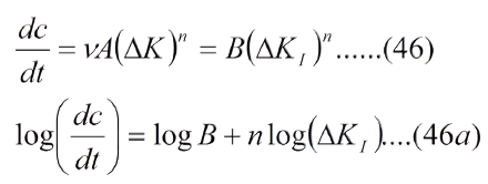 Donde "A" y "n" son constantes, dc/dN es la razón de propagación de la grieta con el número de ciclos, o si N=ν.t, donde ν es la frecuencia de aplicación de las cargas y t el tiempo, entonces dN=ν.dt y, por tanto: