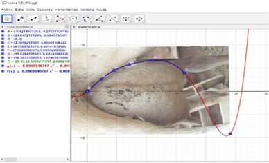 Para el primer método de cálculo del tamaño de la ubre (volumen), se utilizó las fotografías (Fig 2), y se las proceso en el software GeoGebra utilizando puntos, polinomios y funciones matemáticas, que posteriormente fueron integradas desde un límite inicial a un límite final para poder obtener el cálculo del volumen, a través de la siguiente fórmula(10).