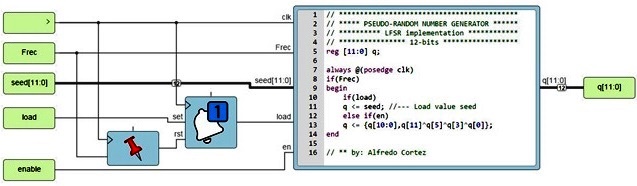 Figure 2 presents the block diagram of the 12-bit LFSR counter generated in Icestudio.