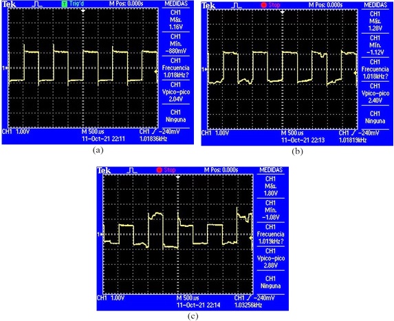 With Square Wave Signal: Noise was added to a square wave signal with an amplitude of 2.04 Vpp and a frequency of 1 kHz. The result can be seen in Figure 10, where (a) represents the signal without noise, (b) represents the signal with 0.412V of noise, and (c) represents the signal with 0.825V of noise.