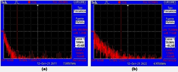 Fig. 12 (a) Frequency spectrum of the noise signal at 100 kHz. (b) Frequency spectrum of the noise signal at 50 kHz.