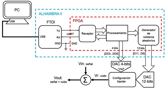 As an immediate application of the designed block, it was used to create the noise-generating equipment. For this purpose, the block diagram shown in Figure 5 was proposed. Its implementation was carried out using the Alhambra II board, which, in addition to containing the free Lattice iCE40XH4K FPGA, includes an FTDI FT2232H IC for serial communication. This IC is required to convert the data sent serially via USB into a TTL signal that the FPGA can understand in UART communication. The FTDI block receives the generator's adjustment parameters sent by the user from a computer in serial form and delivers them to the FPGA. The user-sent adjustment parameters include the voltage, frequency, and seed value for generating random sequences. A 12-bit digital-to-analog converter (DAC) will take samples from the random sequences and convert them into an analog signal, then pass through the bipolar configuration stage for noise signal adjustment. This stage receives the "Vref" parameter from a 4-bit DAC for amplitude adjustment. Finally, the generated noise will reach a mixing network to contaminate signals additively.