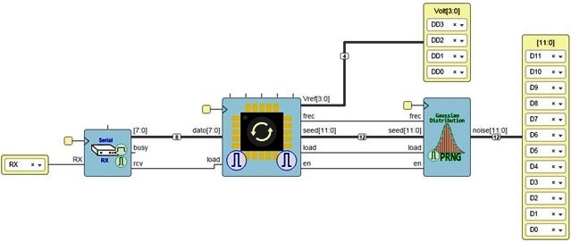 The construction of this design under the Icestudio environment can be seen in Figure 6. The Icestudio tool library includes a block created by the open-source community that allows the reception of data sent in serial form. In this project, that block was used to receive the sent parameters, and a separate block was designed to organize and load the voltage, frequency, and seed value parameters into the Gaussian random sequence generator block. In Figure 6, it can be observed that the pins "DD3, DD2, DD1, DD0" were designated as outputs for adjusting the amplitude of the noise signal in conjunction with an externally connected 4-bit DAC. The pins "D0...D11" were selected for the digital output of the noise signal.