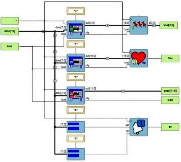 Figure 7 shows the implementation of the block for organizing and loading the voltage, frequency, and seed value parameters under the Icestudio environment.