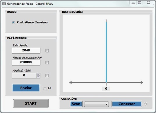 Under the Visual Studio 2019 environment, a GUI was developed to manipulate and interact with each of the parameters required by the noise generator. It consists of a program window organized into four divisions for control organization, as shown in Figure 8. The NOISE area displays the name of the generated noise, in this case, Gaussian white noise. The DISTRIBUTION area allows users to observe the distribution variation adjusted by interacting with the amplitude parameter. The PARAMETERS area contains forms that allow for manipulating the noise parameter data. And in the CONNECTION area, some controls enable establishing a connection with the board.