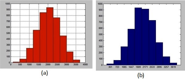Fig. 9 (a) Histogram of the data obtained in the Celery IDE simulator and exported to Matlab to observe its distribution. (b) Histogram of the Gaussian distribution of the generator samples described in Matlab.