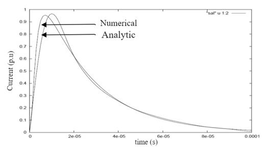 Figure 5 compares the waves obtained numerically with the code in Matlab (both for G=0 and G≠0) and the analytical solution. It can be noticed the difference with G=0. This is because the discharge channel's dissipative characteristics are not considered. The solutions closest to reality are obtained when G≠0.