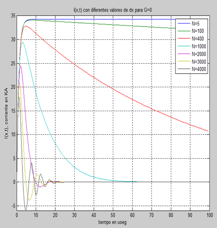 So that you know, the solution of equations (10) and (11) can be used to verify the convergence of the code in the limits of R=G=0. To verify the validity of the solution of the telegrapher's equation (3), in codes where the equation is solved with R=G=0, the current's numerical solution coincides with that of equation (11). A mesh refinement was performed for N=1000, 10000, 200000, and 1000000, and the code remained stable and convergent for all meshes, only with the centered finite difference scheme. With the forward and backward finite difference schemes, the code is unstable for coarse, medium, and fine meshes.