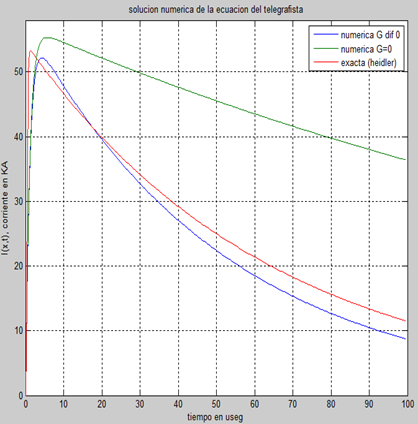 Figure 5 Comparison between the numerical solutions for the conductance parameter G=0 and G≠0 and the analytical solution (Heidler). This plot was obtained with a run of the program in Matlab.