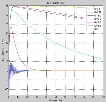 Once the implemented numerical solution was compared with the analytical solution and the codes were validated, we simulated different models. Figure 6 shows the current calculated from Equation (3) for different values of G. In all cases, the start-up time and the differentials were the same. What differentiates them is the attenuation and the stability of the code.