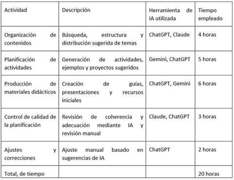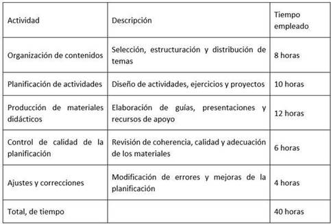 Se evaluaron dos procesos en un mismo grupo de trabajo, por un lado, el primer proceso consistió en hacer la gestión (organización, producción y calidad del tiempo dentro de la planificación docente) sin herramientas de IA, usando métodos tradicionales para la planificación de una asignatura común, encontrando para esto la tabla 2.