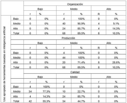 La tabla 4 revela que existe una fuerte concentración de respuestas en los niveles medios de organización y producción cuando se utiliza apropiadamente la inteligencia artificial, con porcentajes de 89,5% y 89,5% respectivamente, y una menor proporción en los niveles altos (10,5% en ambos casos). En cuanto a la calidad, se observa un comportamiento distinto: el mayor porcentaje (55,3%) corresponde al nivel bajo, seguido del 44,7% en el nivel medio, sin registrarse casos en el nivel alto. Esto sugiere que, si bien el uso de herramientas basadas en inteligencia artificial contribuye a mejorar la organización y la producción en la planificación docente, aún persisten desafíos importantes en la mejora de la calidad, donde los resultados se concentran en niveles bajos y medios, evidenciando un área crítica de oportunidad para potenciar el impacto de estas tecnologías.