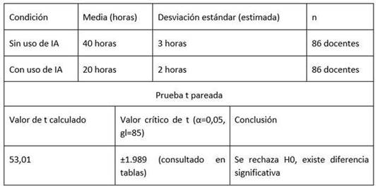 Los resultados de la prueba t pareada confirmaron que la diferencia en los tiempos de planificación antes y después de la implementación de la IA es estadísticamente significativa. El uso de IA permitió reducir el tiempo promedio de planificación de 40 a 20 horas, evidenciando un incremento sustancial en la eficiencia de los procesos educativos.