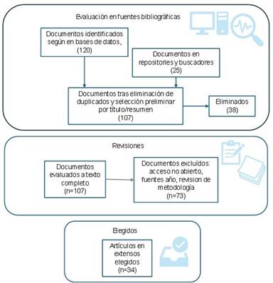 En una primera etapa, se identificaron 145 publicaciones potenciales. Estas fueron sometidas a un proceso inicial de depuración mediante la revisión de títulos y resúmenes, seguido de una verificación exhaustiva del texto completo. Las siete bases de datos consultadas fueron: Google Académico, Dialnet, SciELO, Redalyc, Scopus, ScienceDirect y ProQuest. Durante este procedimiento se detectaron 24 artículos duplicados, los cuales aparecían indexados en más de una base de datos con variaciones en el formato o como publicaciones secundarias.