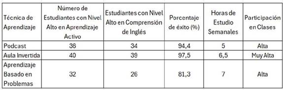 Además, la tabla indica que los estudiantes dedicaron un número significativo de horas de estudio semanales y mostraron alta participación en clases, factores que también contribuyen al éxito en la comprensión del idioma. Por ejemplo, los estudiantes que utilizaron la técnica del Aula Invertida no solo dedicaron 6,5 horas de estudio semanalmente, sino que también participaron muy activamente en clase, lo que pudo haber potenciado sus resultados. Se puede verificar que el aprendizaje activo no solo mejora la comprensión del inglés, sino que también motiva a los estudiantes a involucrarse más en su proceso educativo, demostrando la eficacia de estos métodos en el entorno educativo.