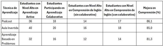 En la tabla se aprecia que, en todas las técnicas de aprendizaje activo evaluadas (Podcast, Aula Invertida y Aprendizaje Basado en Problemas), la incorporación del aprendizaje colaborativo mejora notablemente los resultados. Se puede observar que, en el caso del Podcast, 14 de los 18 estudiantes con un nivel alto en aprendizaje activo alcanzaron un alto nivel de comprensión del inglés sin el componente colaborativo, mientras que esta cifra aumentó a 17 cuando se incluyó el aprendizaje colaborativo, resultando en una mejora del 86,1%. Este patrón se repite con las otras técnicas, siendo menos pronunciado en el Aprendizaje Basado en Problemas, donde la mejora en comprensión alcanza el 81,3%. Estos resultados resaltan la importancia del aprendizaje colaborativo como una estrategia efectiva para potenciar el aprendizaje activo, facilitando una comprensión más profunda y consolidada del idioma inglés.