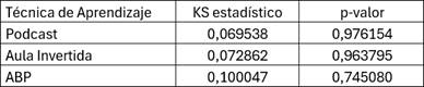 Con un valor p muy alto (0,976154), no se puede rechazar la hipótesis nula de normalidad. Esto sugiere que los datos de comprensión del inglés para la técnica de Podcast siguen una distribución normal. Similar al Podcast, el alto valor p (0,963795) indica que los datos de comprensión del inglés para la técnica de Aula Invertida también siguen una distribución normal. Aunque el valor p es más bajo comparado con las otras técnicas, sigue siendo mayor a 0,05 (0,745080). Por lo tanto, no se rechaza la hipótesis de normalidad para los datos de comprensión del inglés utilizando la técnica de Aprendizaje Basado en Problemas. Por tanto, los resultados de la prueba de Kolmogorov-Smirnov indican que los datos de comprensión del inglés para las tres técnicas de aprendizaje activo no difieren significativamente de una distribución normal, lo cual es una buena indicación de que las técnicas de aprendizaje activo pueden ser evaluadas y comparadas utilizando métodos estadísticos que asumen normalidad en los datos.