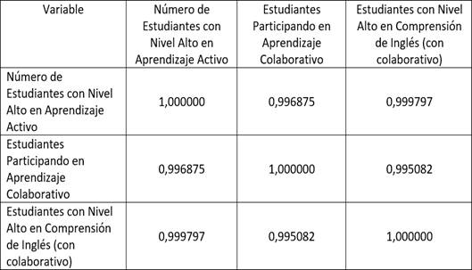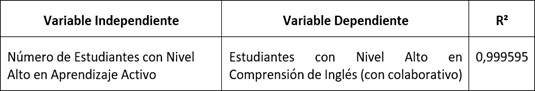 Se observa que la correlación entre número de estudiantes con nivel alto en aprendizaje activo y estudiantes con nivel alto en comprensión de inglés (con colaborativo), presenta una correlación extremadamente alta (0,999797), indicando una relación muy fuerte entre el número de estudiantes con alto rendimiento en aprendizaje activo y aquellos que logran una alta comprensión del inglés con el aprendizaje colaborativo. Mientras que la correlación entre estudiantes participando en aprendizaje colaborativo y estudiantes con nivel alto en comprensión de inglés (con colaborativo), aunque es ligeramente menor, la correlación sigue siendo muy fuerte (0,995082), lo que sugiere que la participación en actividades colaborativas es crucial para mejorar la comprensión del inglés.