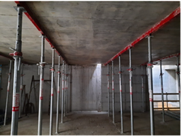 El principio de la construcción en una estructura de concreto armado comienza con el cimbrado de plantas sucesivas, donde los sistemas recién apuntalados reciben el peso del concreto. El cimbrado en una estructura de concreto armado está conformado por un conjunto de componentes como lo son: los tableros de encofrado, las vigas de encofrado y los puntales, que son parte primordial en las diferentes etapas constructivas. Este método consiste en apoyar los tableros, juntamente con las vigas y puntales en el nivel que se va a vaciar el concreto, donde el sistema de cimbrado va a ser el encargado de dar estabilidad y fijación frente a las cargas dadas de acuerdo a la configuración estructural y cargas de uso que vayan a existir en la etapa de construcción (vaciado del concreto) (1). En la Figura 1 se muestra el proceso de clareado in situ, donde se han retirado el 50 % de puntales.