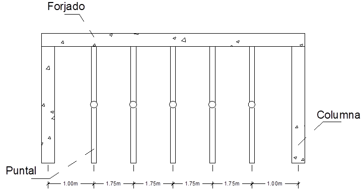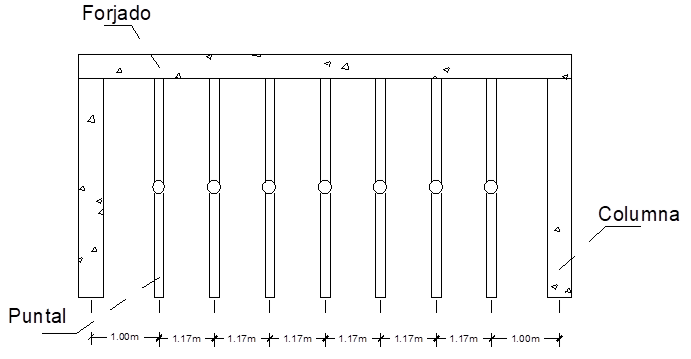 También supone varios apartados donde consideran que el suelo es infinitamente rígido para los puntales que se encuentra por encima del mismo. Por otra parte, la suposición que plantea será únicamente posible siempre y cuando se utilicen puntales de acero, ya que se necesita emplear un elemento rígido, puesto que si se considera elementos auxiliares de madera las afirmaciones previamente planteadas serán erróneas (5). La Figura 2 representa el proceso de cimbrado de una estructura, la cual dependerá de la edad del forjado para su posterior descimbrado.