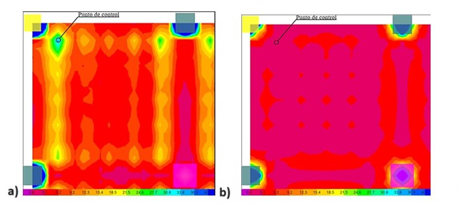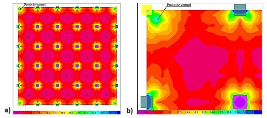 Como se puede observar en la zona de control se encuentra el puntal más cargado cerca de la columna esquinera, los resultados de la Tabla 5 fueron obtenidos justamente del punto de control. Ya que la estructura propuesta es regular, los valores de cada piso de acuerdo con el proceso constructivo se mantuvieron justamente en la esa misma zona. En la Figura 17b, se muestra la zona donde se encuentra el puntal que tiene la carga axial más crítica de 41,32 kN en el proceso de hormigonado. Así también, en la misma zona se obtiene el valor de 48,86 kN en el nivel 4,50 m cuando se realiza el proceso de hormigonado del segundo forjado como se muestra en la Figura 18.