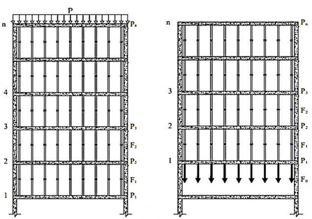 En ese caso también existirán cargas temporales a la hora de vaciar el concreto en cada una de las etapas, estas cargas, como son la de los trabajadores y/o materiales de trabajo estarán presentes en el momento de apuntalar la estructura, en el vaciado del concreto, y cuando el concreto se encuentre alcanzando su resistencia también existirán esas mismas cargas temporales y del peso propio de los puntales que conformaran el segundo forjado y así sucesivamente dependiendo de la estructura (18).