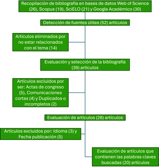 Luego de formular el objetivo general se procedió a seleccionar los artículos al buscar en las bases de datos reconocidas como: Web of Science, Scopus, SciELO, Pudmed y Google Académico, entre otras. Fue realizada una investigación bibliográfica bajo los términos: Actividad trasplantológica; trasplantes, órganos y tejidos. La revisión fue realizada por el autor, quien seleccionó, resumió, redactó y elaboró las recomendaciones. El período de tiempo estuvo comprendido desde 2020 hasta 2023. En la Figura 1 se describe el proceso ejecutado para seleccionar las fuentes bibliográficas.